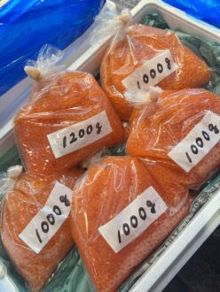 小分けで売ってた「バラ筋子」板みたいにキレイなやつじゃなくて、粒がほぐれ気味だったり膜が破れてたりするタイプなんだけど、家で食べる分には全然アリ。むしろこれ、いくら作る用ならちょうどいいやつ。
