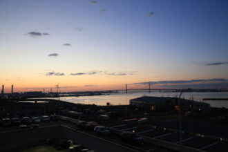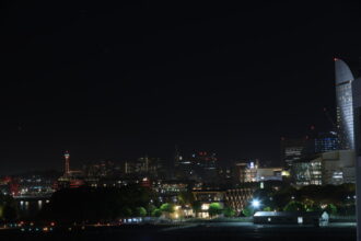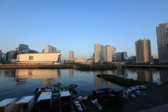 帷子川をはさんでKアリーナ、ヒルトンホテル、 横浜駅東口方面等